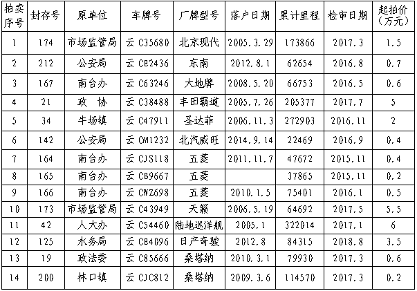 經(jīng)鎮(zhèn)雄縣人民政府批準(zhǔn),公開拍賣鎮(zhèn)雄縣公務(wù)用車改革取消車輛(第三期)14輛。相關(guān)事項如下: