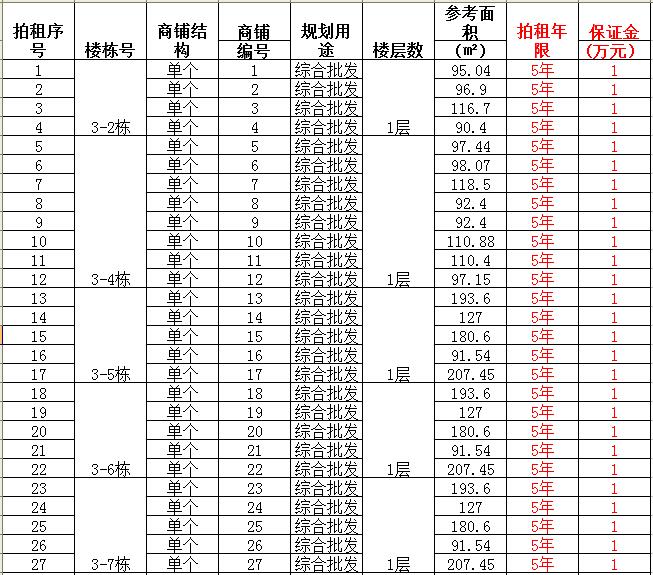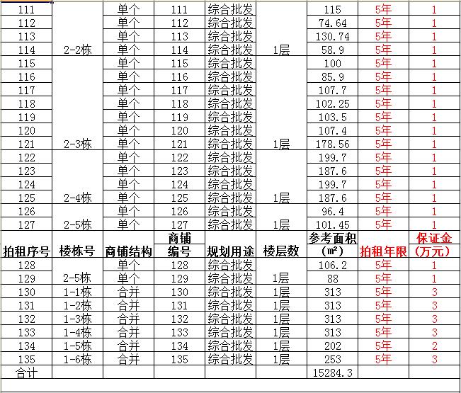 (一)拍租單個商鋪129間,使用期5年,每間商鋪預(yù)交競租保證金1萬元, 詳見商鋪簡介(欲競租多間商鋪,保證金類推);