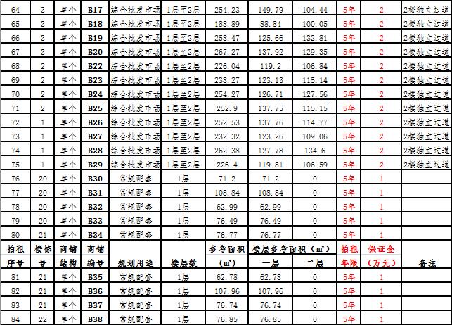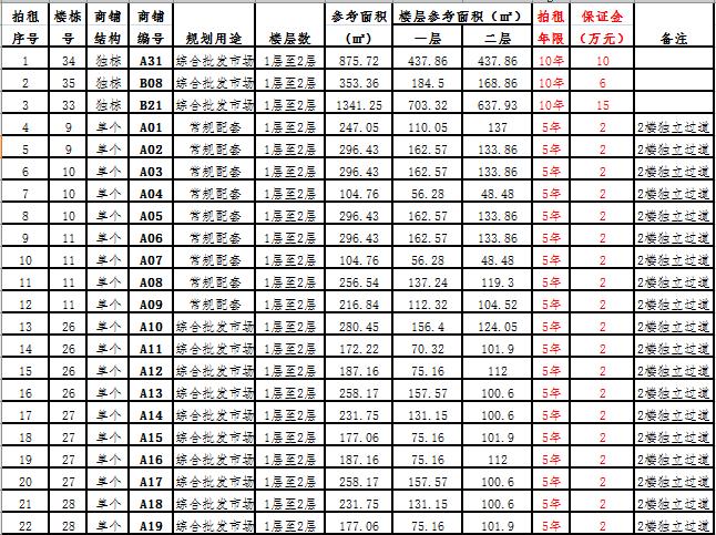 (一)拍租一層至二層獨(dú)棟商鋪3棟,使用期10年,每棟商鋪預(yù)交競(jìng)租保證金6萬(wàn)元至15萬(wàn)元不等, 詳見(jiàn)商鋪簡(jiǎn)介(欲競(jìng)租多棟商鋪,保證金類推);