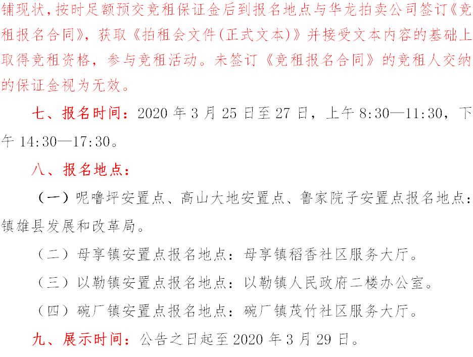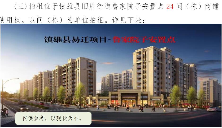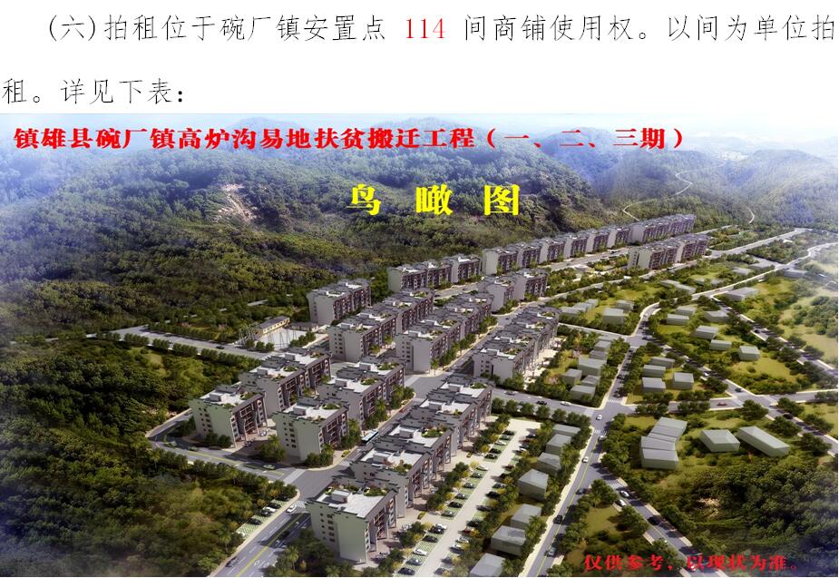 經(jīng)鎮(zhèn)雄縣人民政府批準(zhǔn),受相關(guān)部門(政府)委托,公開拍租位于鎮(zhèn)雄縣易地扶貧搬遷工程呢嚕坪安置點(diǎn)7棟獨(dú)立商鋪使用權(quán)、高山大地安置點(diǎn)27間(棟)商鋪使用權(quán)、魯家院子安置點(diǎn)24間(棟)商鋪使用權(quán)、母享安置點(diǎn)146間商鋪使用權(quán)、以勒物流城安置點(diǎn)67間(棟)商鋪使用權(quán)、碗廠安置點(diǎn)114間商鋪使用權(quán)。相關(guān)事項(xiàng)如下:
